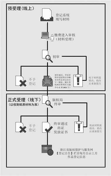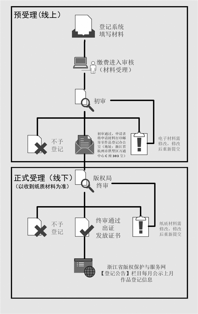 2.按要求填报完成并缴费提交后会进入审核队列依次等待审核,通过初审后需按页面要求准备相应纸件材料进行终审和存档,通过终审的作品会自动生成电子证书并依次安排纸质作品登记证书的发放。