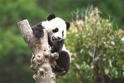 春光正好,中国大熊猫保护研究中心卧龙神树坪基地内的大熊猫们或休息、或玩闹,享受着这美好时光。图为4月24日,一只大熊猫在树上玩耍。