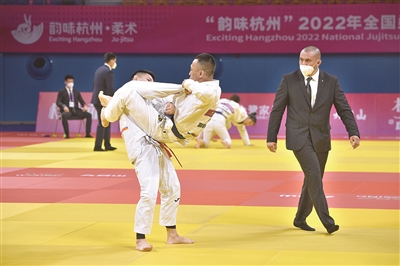 本报讯 (文/记者 童宇倩 摄/记者 范方斌 通讯员 何霞玲)27日,“韵味杭州”2022年全国柔术锦标赛在萧山区临浦体育馆正式拉开帷幕。这是新中国成立后的首场全国柔术锦标赛,也是杭州亚运会前国内柔术竞技水平最高的赛事。当天14时30分许,全国柔术锦标赛“首金”在临浦诞生。