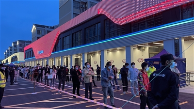 为方便居民按需、就近进行常态化核酸检测,宁围街道在辖区范围内共设置20余个核酸检测采样点位,实现全域覆盖,各点位组织规范有序,检测方便高效,切实做到“早发现”,守牢疫情防控防线。图为振宁社区常态化核酸检测点夜间检测现场。