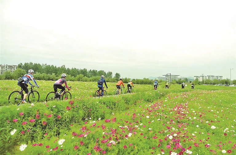 湘湖三期波斯菊在初夏时节静静绽放,为夏日增添一道亮丽风景。图为5月15日,骑行爱好者在穿越花海。