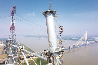 在安徽省池州市贵池区的长江边,有一群电力“蜘蛛人”,他们每天攀爬、行走在二百多米高的跨越电塔上,奋战在白鹤滩—浙江±800千伏特高压直流输电工程池州长江大跨越施工现场,确保国家重点工程进度。“白浙线”是我国实施“西电东送”战略的重点工程,送端连接目前世界在建最大水电站——白鹤滩水电站,受端位于杭州临平区浙北换流站,线路全长2140.2公里。