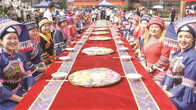 每年的农历五月二十至二十九期间,广西大化瑶族自治县的瑶族群众都要欢聚一堂,举行射弩、斗鸡、打陀螺等瑶族传统的民间文娱活动,欢庆“祝著节”。图为6月23日,广西大化瑶族自治县瑶族群众举办长桌宴欢庆“祝著节”。