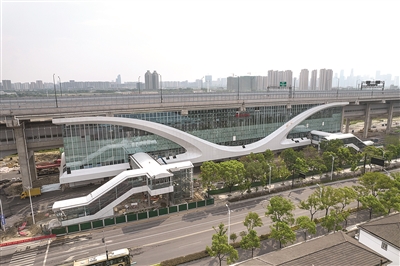 杭州机场轨道快线(地铁19号线)目前全线进入调试。该线西起苕溪站、东至永盛路站,全长约59千米,设有18个站点。其中东段的御道、平澜路、耕文路、知行路4个站点为高架站。图为耕文路站外眺。 记者 范方斌 摄