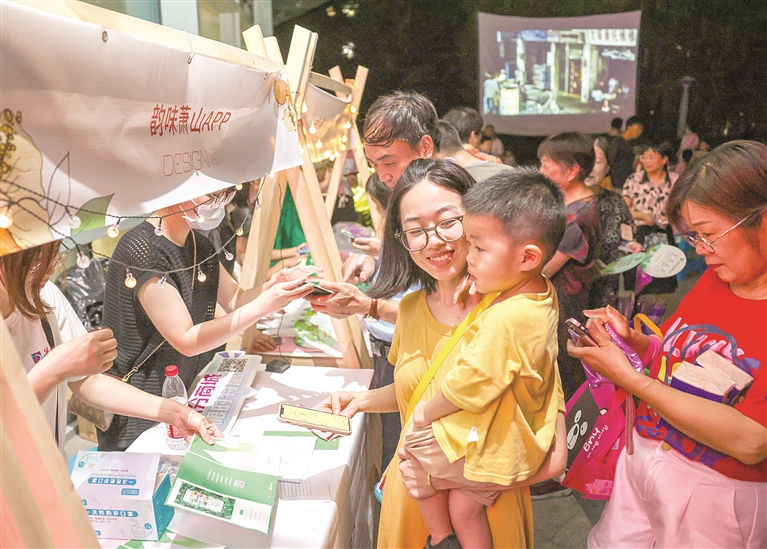 昨晚,萧山日报志愿者服务队走进金稼苑社区,在新白马公寓开展了“下楼逛逛”社区微夜市系列活动,以“循环商店”、非遗手工等“有趣+公益”的市集内容,以及复古的露天电影,为广大居民带来老少皆宜的“游园会”。今后,活动还将在多个社区举行,持续至8月底,打造今夏社区文化节。 首席记者 唐柯 摄