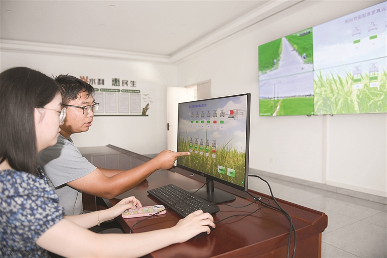 8月10日,在位于绍兴越城区陶堰街道的古越龙山绍兴酒鉴湖糯稻基地,工作人员操作智能精准灌溉远程监控系统为稻田补水。