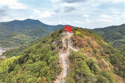 近日,全长7公里的所前镇三泉王村游步道基本完工。山顶制高点建有一座“红心千古情”地标,不仅可以供游客打卡留念,还可以一览山下的秀美风景。 记者 周煜程 摄