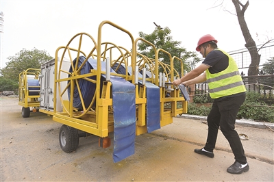为应战台风“轩岚诺”,我区各镇街、部门积极行动,加紧备战,全力做好防御台风各项工作。图为区市政绿化养护保障中心工作人员在检查防汛防台应急物资设备。 记者 范方斌 摄