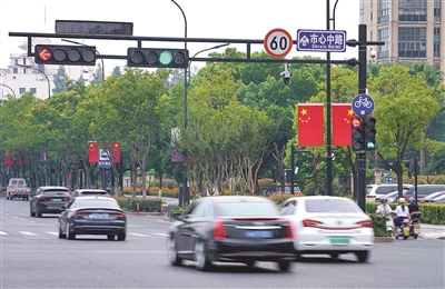 国庆节将至,市心路上部分路段陆续悬挂起了国旗,飘扬着鲜艳的“中国红”,成为近日街头最亮丽的颜色。