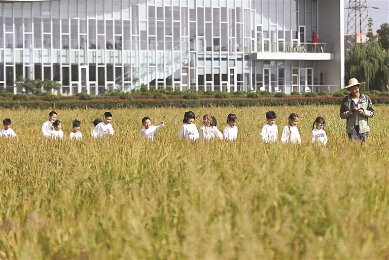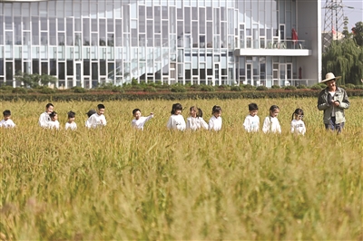 10月14日,浙江省湖州市吴兴高新区中心幼儿园开展世界粮食日主题活动,老师带领小朋友来到灵粮农场参观稻田、学习粮食知识,让一堂幼儿教育课走入自然田野中。图为10月14日,浙江省湖州市吴兴高新区灵粮农场的农技人员带领小朋友参观稻田,介绍种粮知识。
