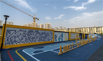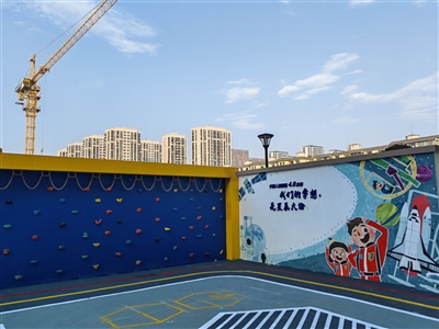 最受孩子们欢迎的是和谐弄小区的小公园改造。曾经斑驳破旧的小区围墙不见了,取而代之的是充满童趣创意的手绘——遨游外太空的小宇航员、可爱的振宁未来社区吉祥物“宁宁”,为孩子们营造出一个色彩斑斓的游乐空间。而攀岩、乐高拼字等功能的嵌入,更是为孩子们插上了创意想象的翅膀。地面的改造更是贴合孩子们游玩的需要,铺设橡胶颗粒,还贴心地绘制了“跳房子”图案,让孩子们同时享受“智力”和“运动”的乐趣。
