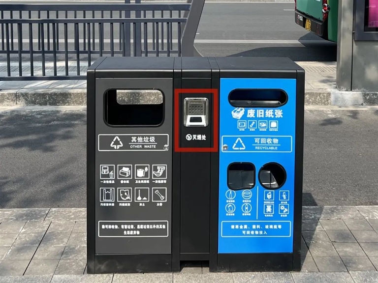 新型果壳箱采用不锈钢箱体,有大小各异5个投放口,外壳为黑色,配套按垃圾类别喷涂灰色和蓝色分类箱漆面。在箱体正面分别印有“其他垃圾”和“可回收物”字样和相应图案,更浅显易懂,像塑料瓶要投放进“可回收物”垃圾桶,而废旧报纸、书籍要放入专门的投放口等,在引导市民分类投放垃圾的同时,也将提升环卫工人垃圾分类清运的效率。果壳箱中间的烟蒂投放口也花了心思,倾斜的不锈钢板便于大家先掐灭烟头再投放,里面有一个不锈钢小盒子,方便烟蒂收集和环卫工人清扫。