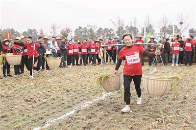 11月15日,在德清县举办的美好家园运动会暨新安镇稻田争霸赛上,村民参加挑稻谷接力赛。