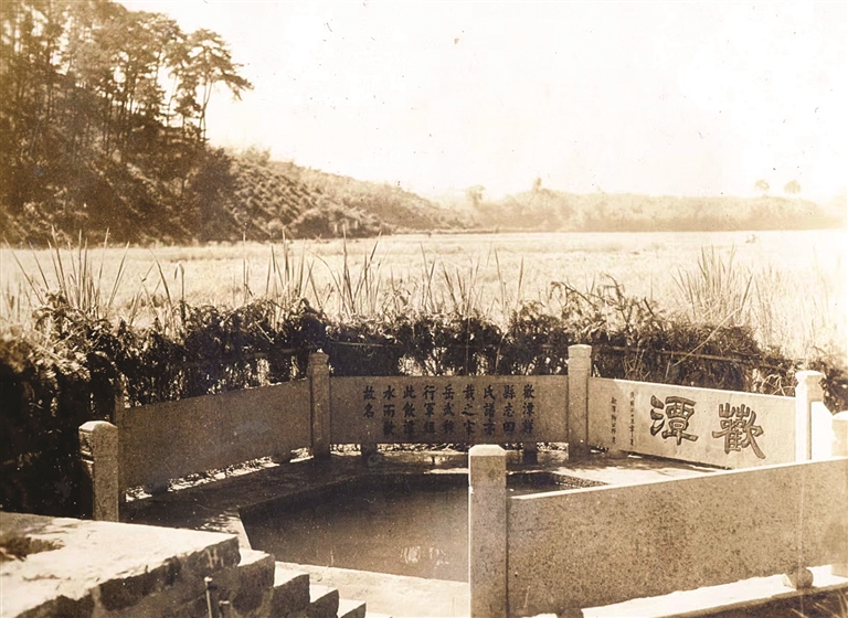 这个水潭直径3米,深约1米,就在欢潭村村口湖边,一年四季水质澄清,不会干涸。后人为纪念这段故事,将这潭泉水围成七角形,以青石板作栏,石栏上刻有“宋岳武穆行军经此,饮潭水而欢”字样。