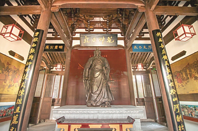 欢潭岳园,是进化之行的必去打卡点。武穆祠中,有一尊近三米高的岳飞站像,他身着战袍,左手持书卷,右手扶剑,一副英俊勇武、文武双全的形象。在像身背后,是一面石雕墙,雕刻有岳飞的书法真迹。欢潭亭中,轻纱染墨,微风一起,顿显古韵飘逸。