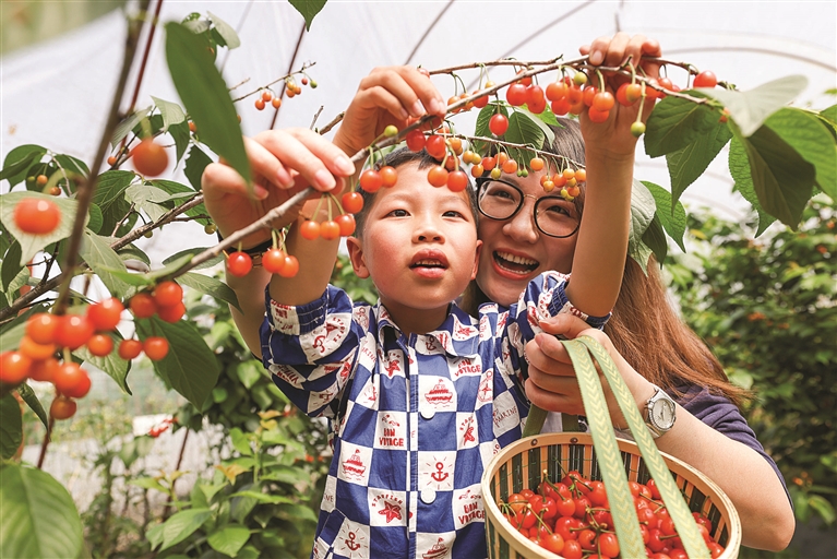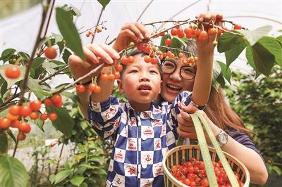 所前镇种植樱桃2000余亩,当下正迎来收获季,吸引很多游客前往采摘。图为近日游客在所前镇袄庄陈村阿灿樱桃园采摘樱桃。