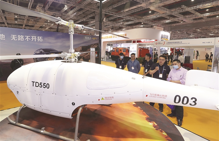 5月8日,参观者在一架大载重应急救援无人机旁交流。当日,以“推进高水平安全 护航高质量发展”为主题的第二届长三角国际应急减灾和救援博览会在国家会展中心(上海)开幕。作为“长三角地区5·12防灾减灾宣传周”活动之一,博览会围绕应急管理、灾害普查、智慧消防、应急救援、智慧城市等内容,聚焦“全灾种、大应急”,通过展览、会议和论坛科普等多种形式,推动安全应急产业融合发展和转型升级。
