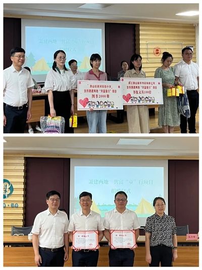 活动现场,萧山区银河实验小学、浙江萧山新华书店有限公司等爱心单位为建德市困境儿童捐赠图书2000册、书包文具100套。
