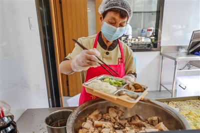 位于义桥镇昇光村的“义孝大食堂”,是全区首个农村“中央老年食堂”,这里总面积达180平方米,内设阳光厨房和餐厅,可同时容纳80人堂食。每天上午菜品出锅后,厨房工作人员迅速分餐装车,随后四辆配送车统一出发,把热腾腾的饭菜送到订餐老人的家门口。目前,义桥镇已建有这样的“义孝大食堂”2家,实现了全镇26个村社全覆盖,有效解决了全镇所有特殊老人的吃饭难题。