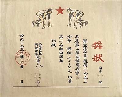 图4:1954年杭州树范中学陈丽华跳远比赛第一名奖状