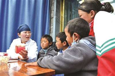 近日,上海市徐汇区牙病防治所的医务工作者来到西藏浪卡子县普玛江塘乡,为当地居民普及口腔保健知识并进行义诊服务。普玛江塘乡海拔5373米,是我国海拔最高的乡。图为上海市徐汇区牙病防治所医生苏红如向小朋友科普牙齿保健知识。