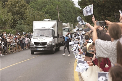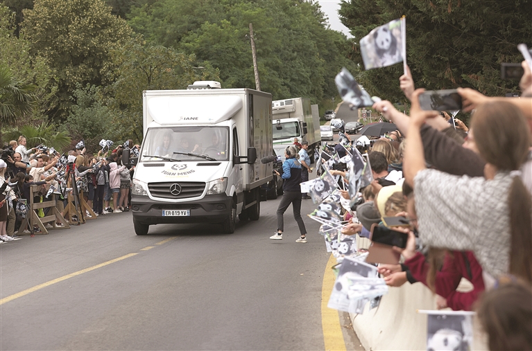 图为25日,在法国圣艾尼昂市博瓦勒野生动物园外,人们送别搭载熊猫“圆梦”的车离开。