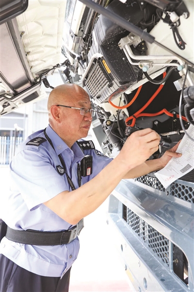 虽然临近退休,但方有法对待工作的热情并没有减退,是一名当之无愧的“全能型”老将。他熟悉各种不同类型的车辆,也了解轮胎规格、制动系统、排气数据等各种参数。快速查看车辆的车架号和发动机号,观察车辆是否有改动,各配件是否能正常使用……一整套操作下来,可谓行云流水。