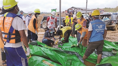 8月15日,在缅甸克钦邦帕甘镇,救援人员在玉石矿场坍塌事故现场包裹搜救到的遇难者遗体。缅甸北部克钦邦帕甘镇警方15日向新华社记者确认,因13日该镇一玉石矿区坍塌而死亡的人数已增至19人,均为男性。相关搜救工作仍在进行中。