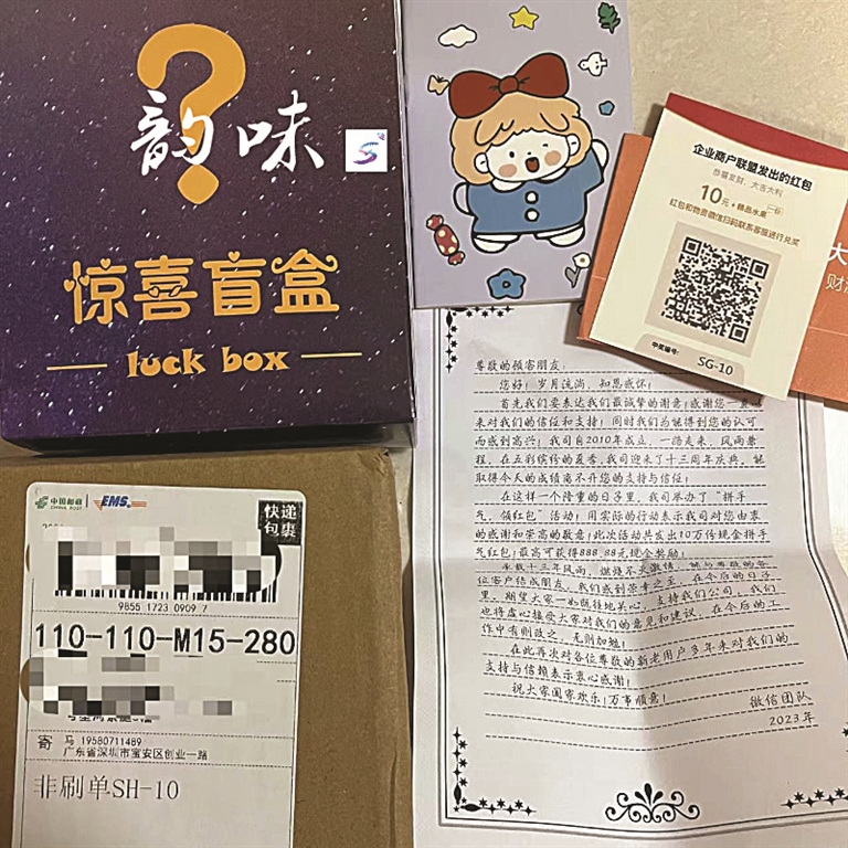 没想到的是,收到这个陌生快递的第三天,网友“八卦”又收到一个陌生快递。这次的快递是深圳寄过来的。快递里面是一个惊喜盲盒,打开后,有个小红包,里面是一份落款为“微信团队”的邀请函和一张带有二维码的红包券,扫码拿10元红包和当季水果一份。