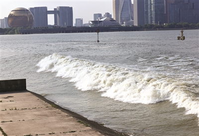 每年农历七月,钱塘江大潮逐渐进入最佳观赏期。图为2日(农历七月十八)15点42分许,钱塘江大潮经过七甲闸,冲击江堤激起数米高大浪。