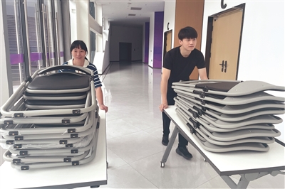 足足三四个小时,“欢哥”就这样带着大家在不同的场馆房间、办公区域进行切换,最终将300多个桌椅、柜子等摆放到位。