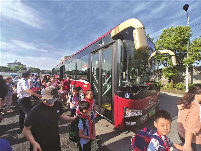“小朋友,你叫什么名字,是红牌牌还是蓝牌牌啊?”“红牌牌是1号车,蓝牌牌是2号车。”……不时有家长牵着娃娃的手走来,经过志愿者的核对后,坐上了“求知专线”等待出发。