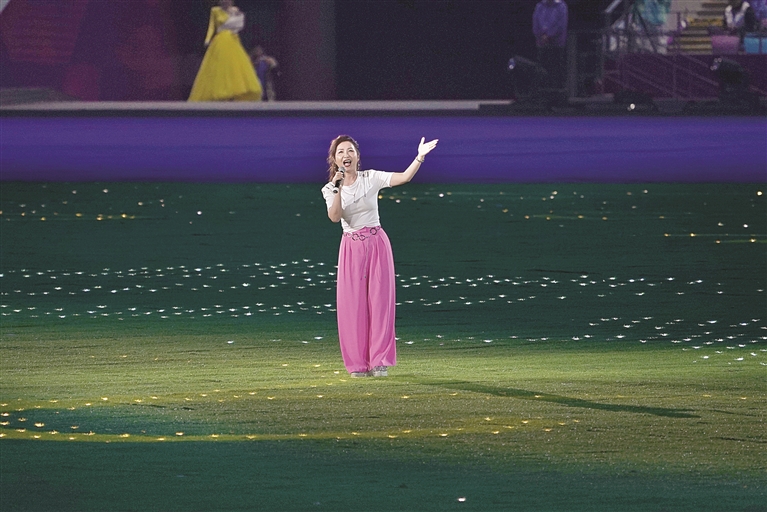 释放青春活力。舞台上,叶子用优美的歌声、澎湃的热情和昂扬的姿态,完美呈现了亚运的竞技活力与青春的感染力,表达了对杭州亚运会圆满收官的美好祝福。