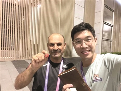 在运动员村,“Exchange pins?”可以作为大家交流的常用方式,通过交换徽章给大家留下美好的回忆,每一枚互换的徽章背后都有不一样的故事,这不仅是纪念品,也是文化和友谊的交融。曾经在村里和村外两次遇到约旦的教练和哈萨克斯坦运动员,因为第一次见面交换了徽章,在第二次见面时我们都还记忆犹新。我帮助哈萨克斯坦运动员去了河坊街。茫茫人海,相隔万里,我们因亚运会相聚在此,能有幸见面,由衷感叹“缘”字的奇妙。
