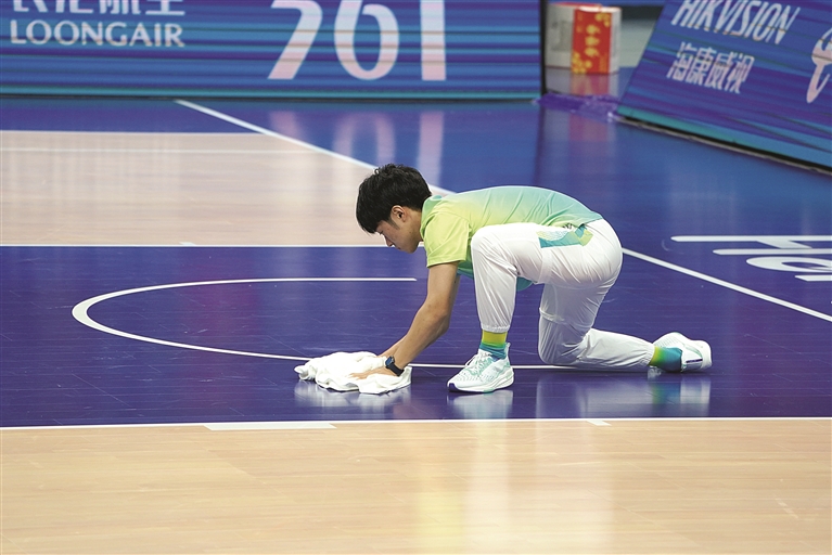 这份工作说来简单,里头的紧迫感只有处于现场的工作人员才能体会,“擦地也是要讲究‘时机’的,比如等到两个球队过了半场,到了对面,我们才能上去擦地,否则就会影响赛事的进行。”