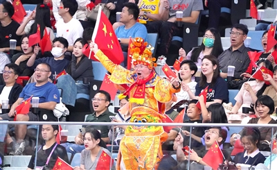“显眼包”不分年龄大小,55岁的章亦洪绝对是观众席里最亮眼的一道风景。女篮决赛当天,他专门从富阳常绿镇赶到现场,身着东吴大帝戏服,在看台上一边挥舞着国旗,一边用浑厚的嗓门呐喊“中国女篮加油”“中国必胜”,把身边一片观众的热情都带动起来了。