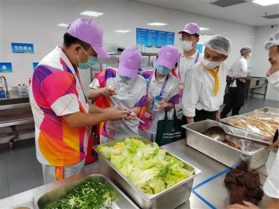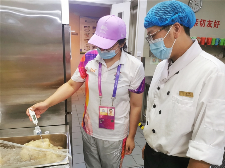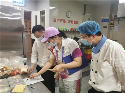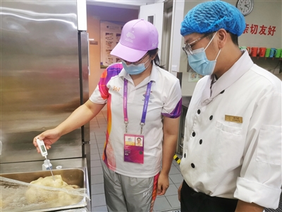 “每天,我们都会对餐饮从业人员进行健康抽查,包括测温、检查手部、衣帽和五大类症状的询问,对烹饪好的食品中心温度、接触即食食品容器和餐用具的洁净度、消毒水浓度、食用油品质等进行检测。同时,我们还会提前审核菜单,督促酒店每餐做好食品留样,并对每餐供餐食物进行核对。”应佳恩说,这样的监管覆盖从原材料、加工烹饪到储存环节的全流程,确保食品安全。