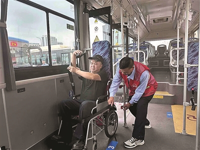 车辆中间原先的十排座椅被拆除,设置了轮椅专位,12米的车辆可以同时停放6辆轮椅车。且每个轮椅停放区域后面加装了轮椅安全带、人员三点式安全带,还贴心地加装了布艺背板,轮椅运动员倚靠时可以更加舒适。这些无障碍装置通过螺丝牢牢固定,确保轮椅运动员在行车途中安全无虞。不仅如此,后车门处的无障碍踏板已经更换了崭新的防滑脚垫,方便运动员下车。公交公司还对保障亚残运会的公交驾驶员进行专项职业培训,确保运动员们乘车的安全性、稳定性、舒适性。