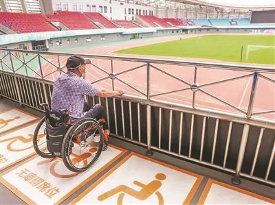 萧山区体育中心作为重点改造场馆之一,共设置无障碍车位12个、无障碍卫生间20个、无障碍轮椅席位24个,同时还增设了无障碍升降平台、低位服务台以及带有中英文盲文的无障碍电梯等设施。