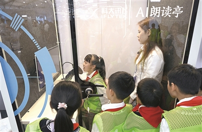10月24日,小朋友们在第六届世界声博会上参观体验AI朗读。