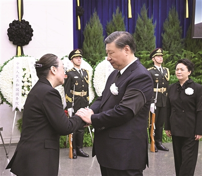 上午9时许,习近平和夫人彭丽媛,李强、赵乐际、王沪宁、蔡奇、丁薛祥、李希、韩正等,在哀乐声中缓步来到李克强同志的遗体前肃立默哀,向李克强同志的遗体三鞠躬,并与李克强同志亲属一一握手,表示慰问。胡锦涛送花圈,对李克强同志逝世表示哀悼。