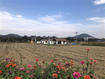 远远望去青山如黛,意境深远。近处是连绵的稻田和美丽的庭院,田野里的稻子刚收割完,到处散发着清新的泥土气息和浓郁的花香。花不仅栽种在村民的家里,也栽种在田间地头,红的黄的粉的,充盈着村民们的精神生活。