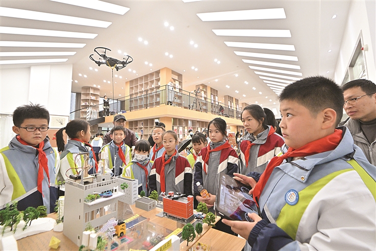 无人机送快递、机器人搡年糕……昨日,湘湖小学2023年科创节暨第六届校园STEAM大赛在湘湖社区湘守广场举行,50多个“未来社区”项目展示了孩子们动手实践、合作创新的能力。图中学生正在模拟无人机送快递。