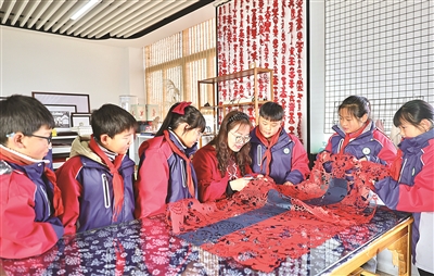 新年伊始,瓜沥镇明德学校的“昭东剪纸”传承人沈雅丹老师,向学生们展示新作,并传授剪纸技艺。作品以华表为中心,将传统和现代元素相融合,展现祖国新成就,歌颂祖国新气象。