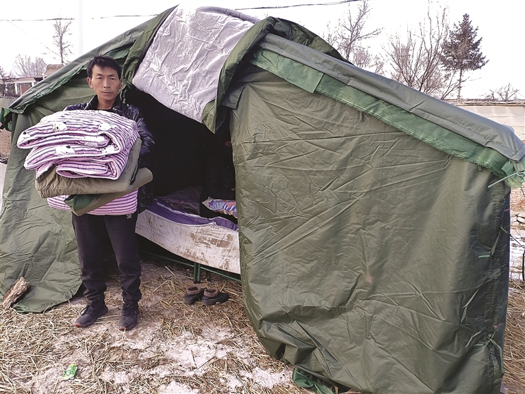 本报讯(记者 朱林飞)孙国登是甘肃省积石山县的一名受灾群众。他常年在新疆务工,去年回村里修建了一层住房,没想到刚住进新房不久,就遭遇了此次地震,造成房屋倒塌,一家四口只能暂时在外面的棚子里住着。