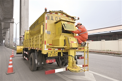 寒潮来袭,我区各部门和镇街做好防寒抗冻准备工作,积极应对极端天气。图为交投集团准备好融雪剂撒布机等设备和物资。