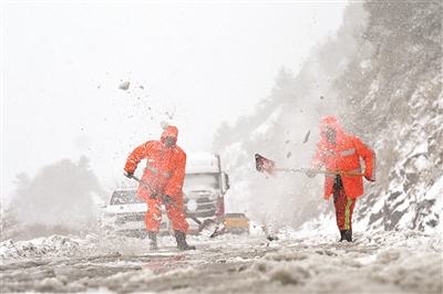 1月22日,在湖南省娄底市双峰县井字镇黄巢村,路政人员在撒盐除雪。