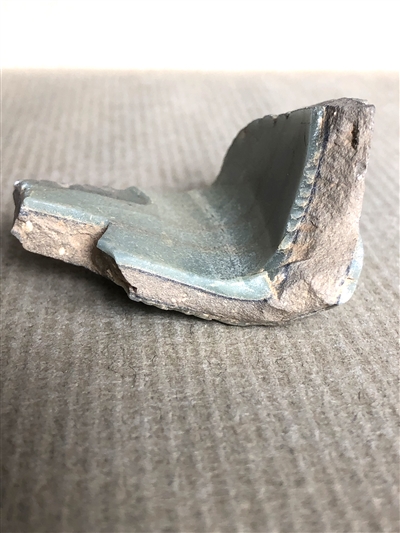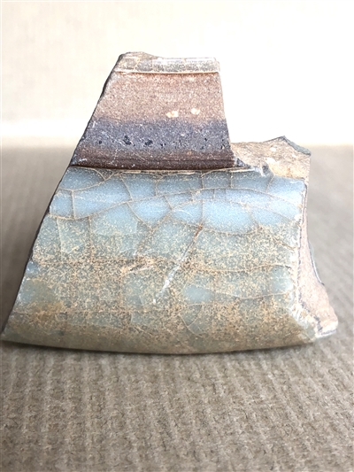 俗话说,贼不走空。走之前,我也想从他这里寻块南宋官窑片。他从墙角拿了个鞋盒出来,我一眼就被盒子里的这块南宋官窑底足片所吸引,它底部平整,也是用垫圈垫烧,同样留下了一段玉瑗状的痕迹,可以媲美那块擦肩而过的官窑片。