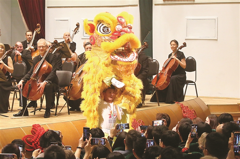 2月2日晚,2024“温暖迎春·共庆中国年”白俄罗斯华侨华人新春交响音乐会在白俄罗斯明斯克的白俄罗斯国家音乐厅举办。这是音乐会上的中国传统舞狮表演。
