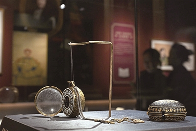 图为展出的故宫博物院藏铜镀金壳开光人物像怀表。